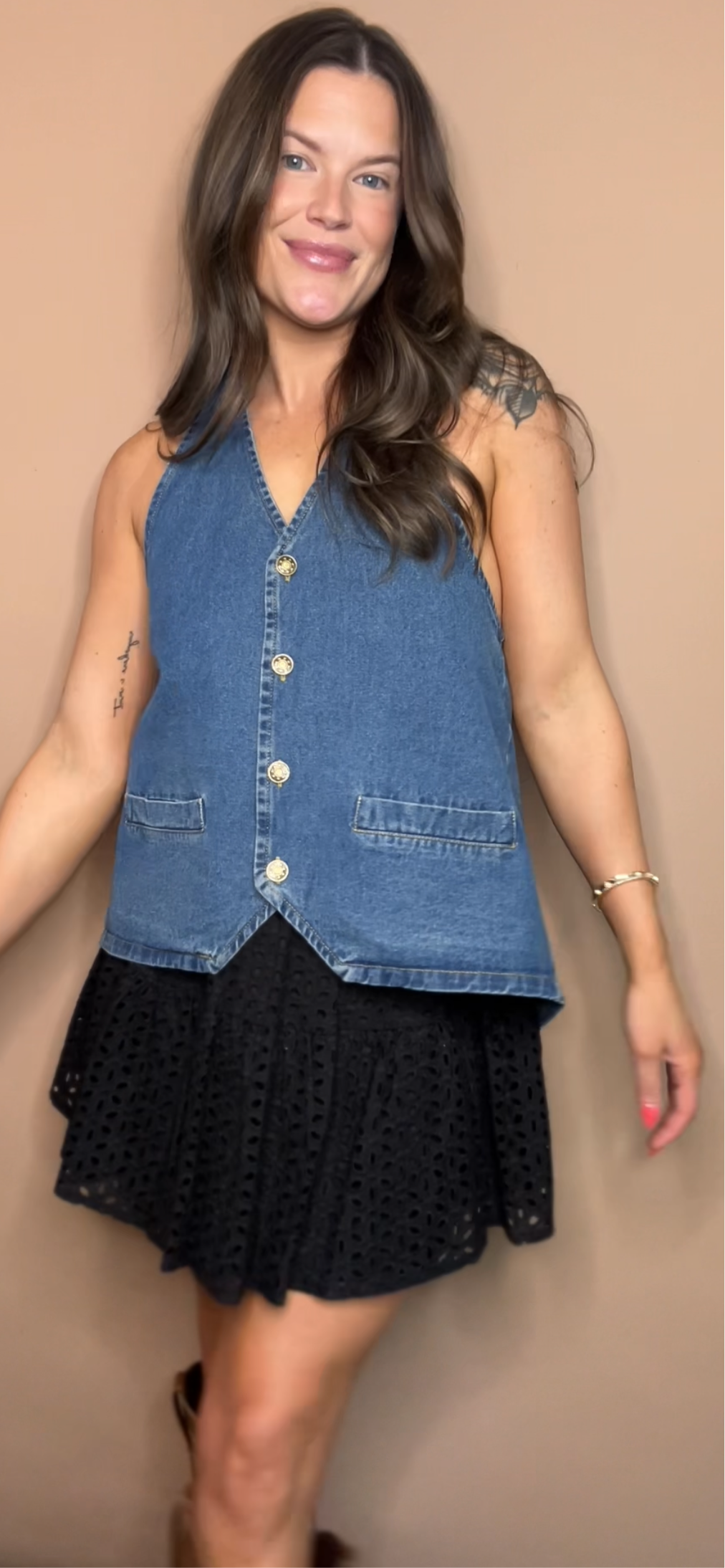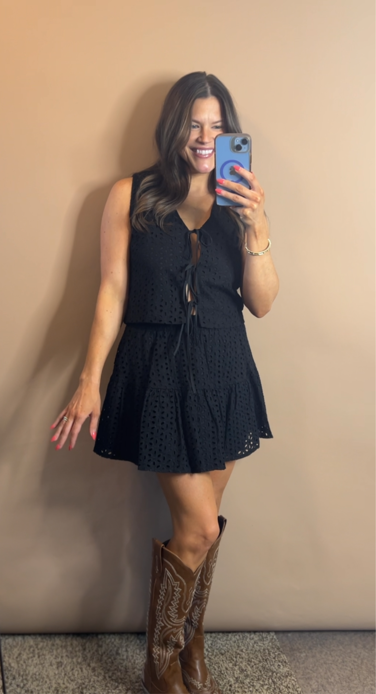 Flirty, feminine, and made for twirling — The Heartstrings Skirt is the perfect match to the Heartstrings Top. Designed in black eyelet with a tiered silhouette, this mini sits comfortably at the waist and moves with you from day to night. Pair it with the matching top for the full set moment, or style it with a cozy knit or graphic tee for an effortless mix of sweet and cool.