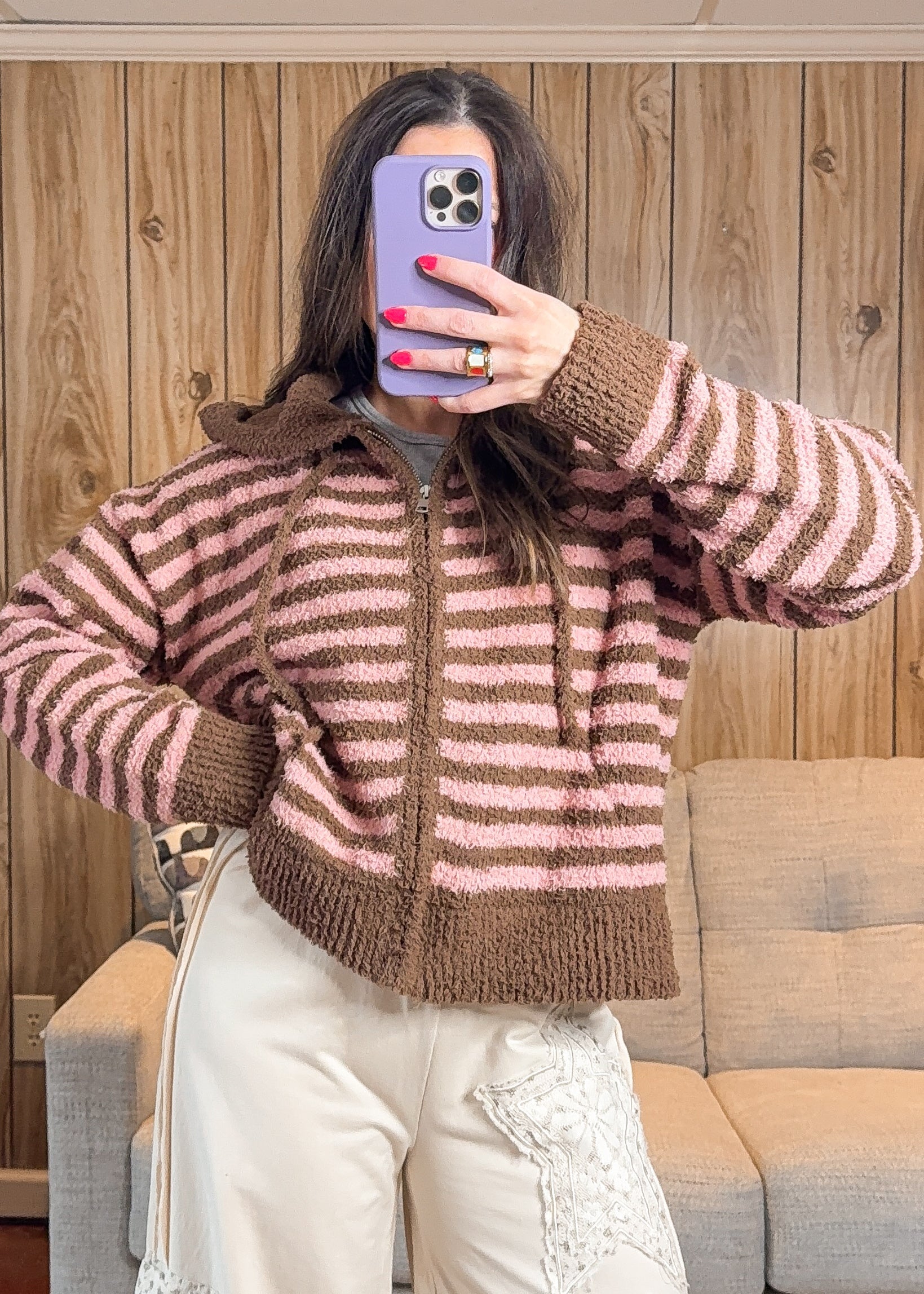 This zip-up hoodie is made from a super soft, blanket-like fabric you’ll want to live in. Designed with a relaxed, true-to-size fit and a little extra room for comfort, it features a full zipper and an easy hood that makes it perfect for layering or wearing on its own. Effortless, comfy, and cute enough for everyday wear.