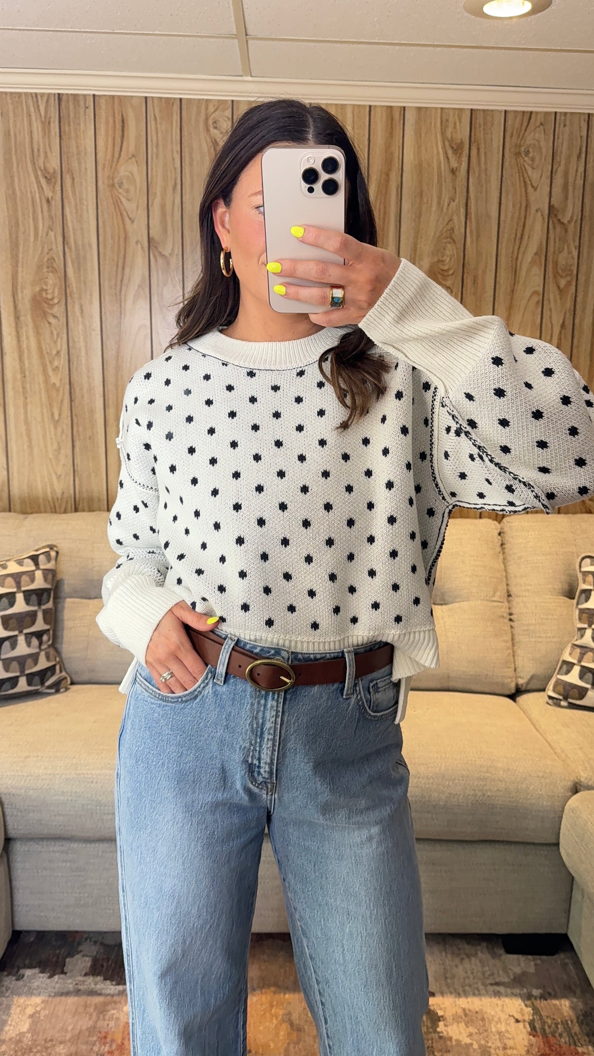 The Ellis Sweater is cozy, classic, and made for fall days. Designed in a soft cream knit with black dot detailing, it adds a touch of texture and charm to any outfit. True to size with a comfortable fit. Size up if in between sizes for a roomier feel. Model is wearing a size Small.